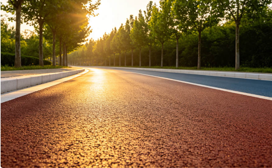 冷拌彩色透水沥青混凝土面层系统是一种通过摊铺设备(常规沥青面层摊铺机)将冷拌改性沥青混合料快速摊铺成型的高效施工方案。成型厚度一般为0.7~1.5cm,面层骨料可以使用3~5mm粒径,也可使用1~2mm粒径,一般作为新建道路的彩色沥青面层,也可用作在原有路面上加铺冷拌彩色沥青面层。